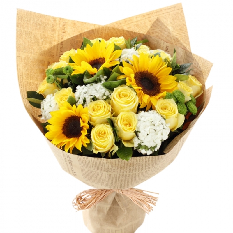 Маттиола 4 шт., Подсолнух 3 шт., Роза 14 шт., Хризантема 2 шт. |