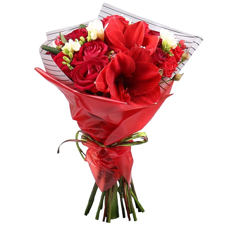 Букет состоит из 15 роз, 3 кустовые розы, 1 амариллис, 5 белых фрезий, 3 ветки гиперикума, красивая упаковка, атласная лента.
