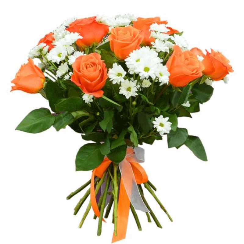 Букет состоит из 11 оранжевых роз, 6 веток белой хризантемы, прозрачная упаковка, оранжевая лента.