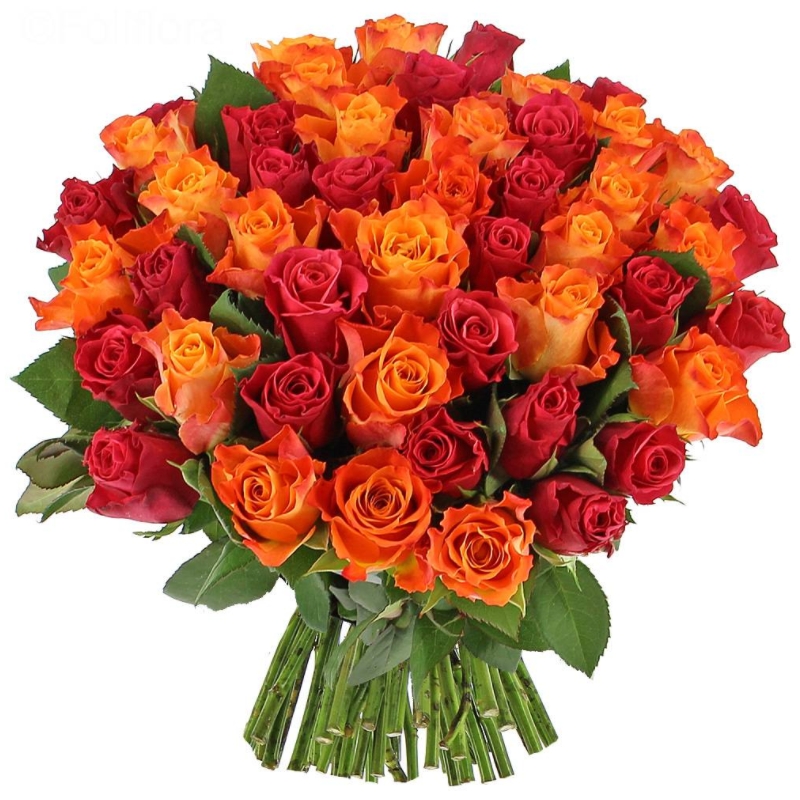 Букет состоит из 26 красных роз, 25 оранжевых роз, прозрачная упаковка, атласная лента.